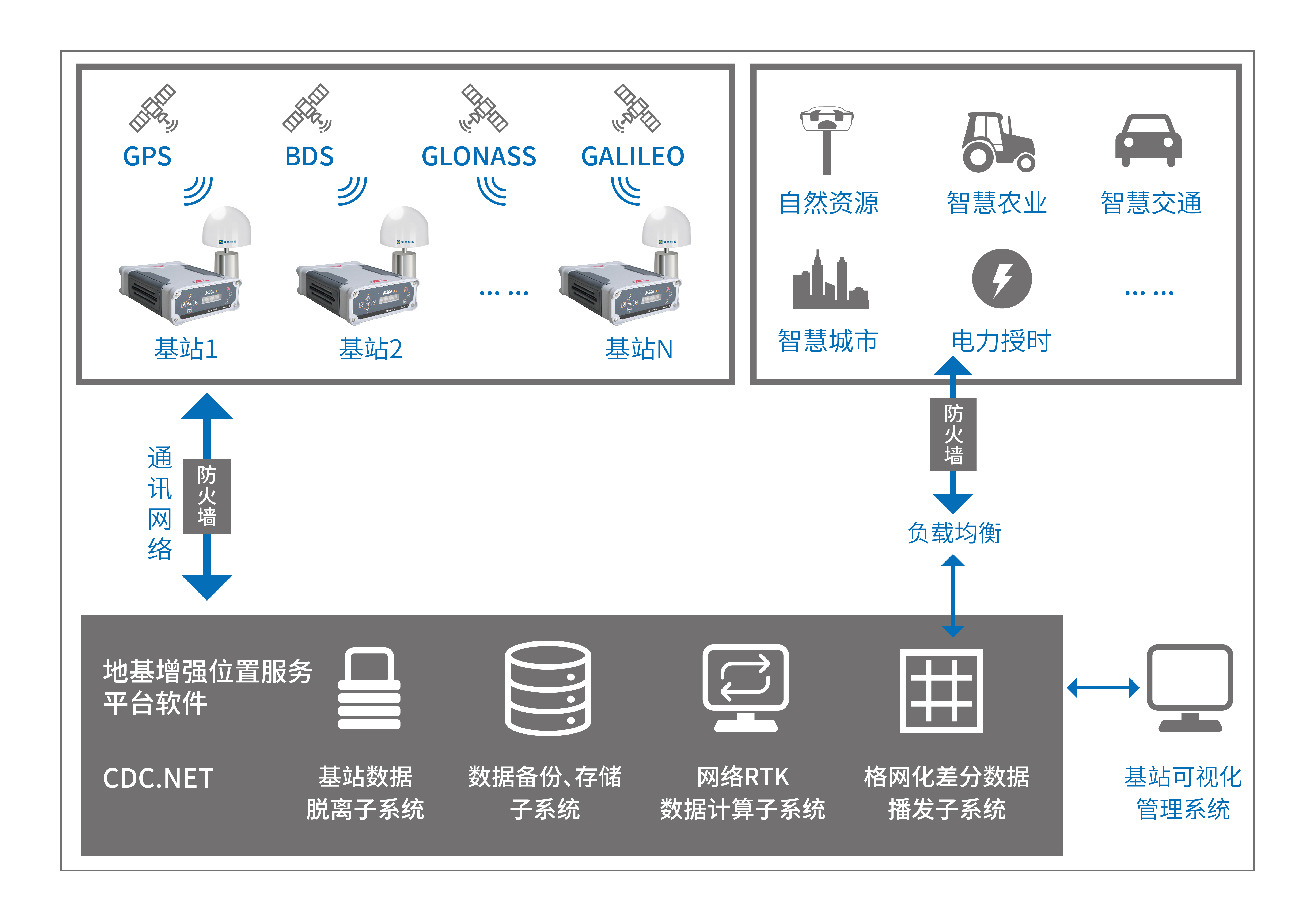 司南连续运行参考站是一个高度集成化的监测系统,以自主研发、完全国产化的软硬件设备与地方产业深度融合建设高精度定位基准服务网,提供了一整套采集、数据处理、数据分发、数据管理的先进解决方案。M300 Pro 接收机作为CORS系统的核心设备,通过计算机和网络技术,向数据控制中心实时传输GNSS观测数据信息,向管理人员提供运行状态信息查看、远程设置、固件升级等服务。