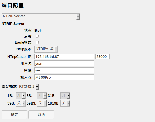 2、 进入端口配置页面,选择ntrip的版本,一般选择V1.0。然后配置远程caster的IP和端口号,若用本机的caster,则设置为本机的IP。输入用户名和密码,然后选择播发的报文类型和报文种类,点击确定即可。
