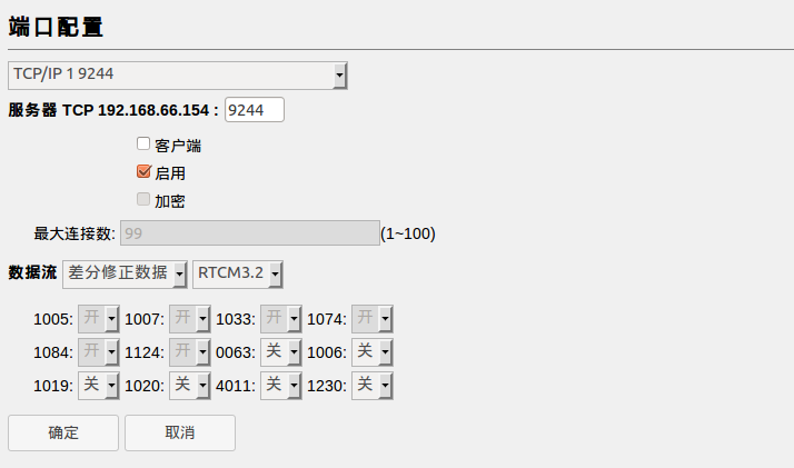 进入“端口配置”页面,选择5路TCP/IP的任意一个,点击“设置”,进入页面如图2.4所示。首先设置服务器的端口号(图示“9244”位置), 选择启用,注意不能选择客户端。然后设置数据流,根据需要选择不同的数据流,点击“确定”就完成了TCP Server的设置。另外当接收机设置为TCP Server模式时,接收端必须是client模式,反之则反。