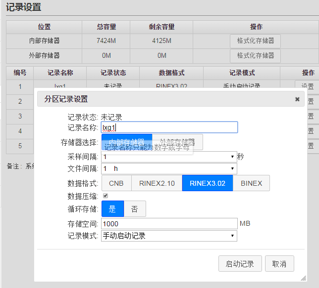 数据记录是参考站接收机最基本的功能,可以根据本机记录的数据进行后处理分析或者故障追踪。通过web页面登陆,进入“数据记录”页面。M300Pro提供5线程数据记录功能,即可以同时记录5路静态数据。页面如图2.1所示。点击“设置”按钮,弹出分区记录设置对话框,在该对话框中填写所需要的信息。需要注意的是数据压缩功能只在选择第一个记录的RINEX格式数据存在,存储空间的设置范围为400~总容量。设置完毕后,数据就在M300Pro接收机的内置存储器中进行记录了。